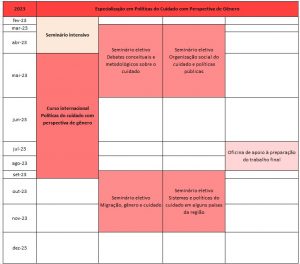 A Especialização em Políticas do Cuidado com Perspectivas de Gênero terá duração de 12 meses e exige a realização de: