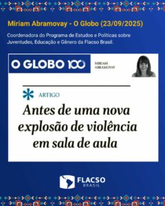 A coordenadora do Programa de Estudos e Políticas sobre Juventudes, Educação e Gênero da Flacso Brasil, Dra. Miriam Abramovay, publicou hoje (23/09) no jornal O Globo o artigo “É preciso agir antes de uma nova explosão de violência em sala de aula”.
