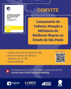 A Flacso Brasil, em parceria com a SOWETO Organização NEGRA, realizará no dia 30 de outubro, às 19h, o lançamento do Caderno FLACSO nº 26 – “Atuação e Militância de Mulheres Negras no Estado de São Paulo”. O evento será realizado na sede da SOWETO (R. Silveira Martins, 131, sala 22), em São Paulo, e contará com formato híbrido, permitindo a participação presencial e virtual. Quem não puder comparecer poderá acompanhar a transmissão pelo canal: youtube.com/SOWETOorganizaçãoNEGRA